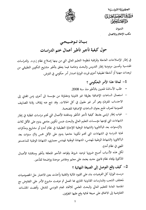 في إطار الإصلاحات العاجلة والمرتقبة لمنظومة التعليم العالي التي من بينها إصلاح نظام إ.م.د. والدراسات الهندسية وتحسين مردودية إطار التدريس والبحث وخاصة فيما يتعلق بتأطير مشاريع التكوين التطبيقي من تربصات مهنية أو أنشطة تطبيقية أخرى قررت الوزارة اصدار أمر حكومي في الغرض.