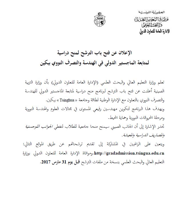 أعلنت وزارة التعليم العالي والبحث العلمي عن فتح باب الترشح لمنح دراسية لمتابعة الماجستير الدولي في الهندسة والتصرف النووي ببكين.