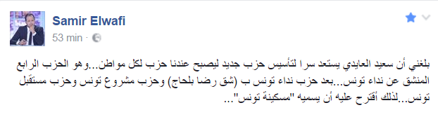 و قد علّق الوافي ساخرا في تدوينة له على الفايسبوك أنّ كل مواطن أصبح له حزب مضيفا أنّه "الحزب الرابع المنشق عن نداء تونس...بعد حزب نداء تونس ب (شق رضا بلحاج) وحزب مشروع تونس وحزب مستقبل تونس"
