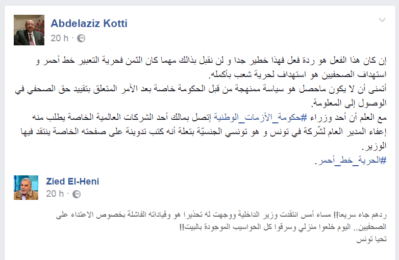 وفي هذا الخصوص، أكّد عبد العزيز القطي أنّه "إذا كان ما تعرّض له زياد الهاني ردة فعل فهذا خطير جدا و لن نقبل بذالك مهما كان الثمن فحرية التعبير خط أحمر و استهداف الصحفيين هو استهداف لحرية شعب بأكمله".
