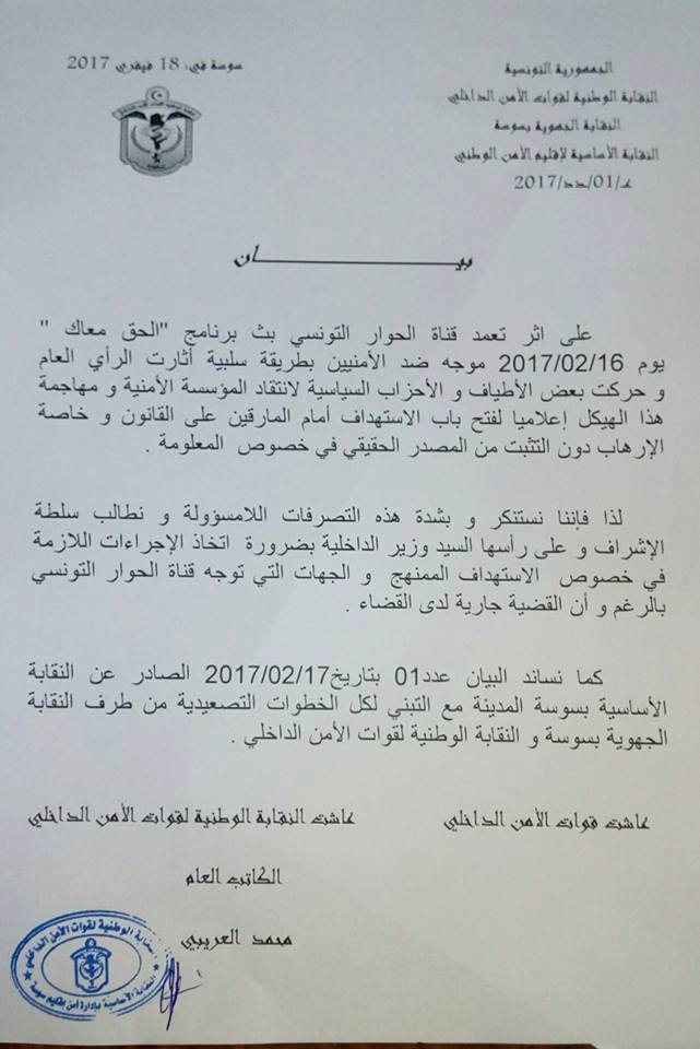 وطالبت النقابة الوطنية لقوات الأمن الداخلي وزارة الداخلية وعلى رأسها الوزير باتخاذ الإجراءات اللازمة بخصوص الاستهداف الممنهج والجهات التي توجّه قناة "الحوار التونسي رغم أنّ القضية جارية لدى القضاء.