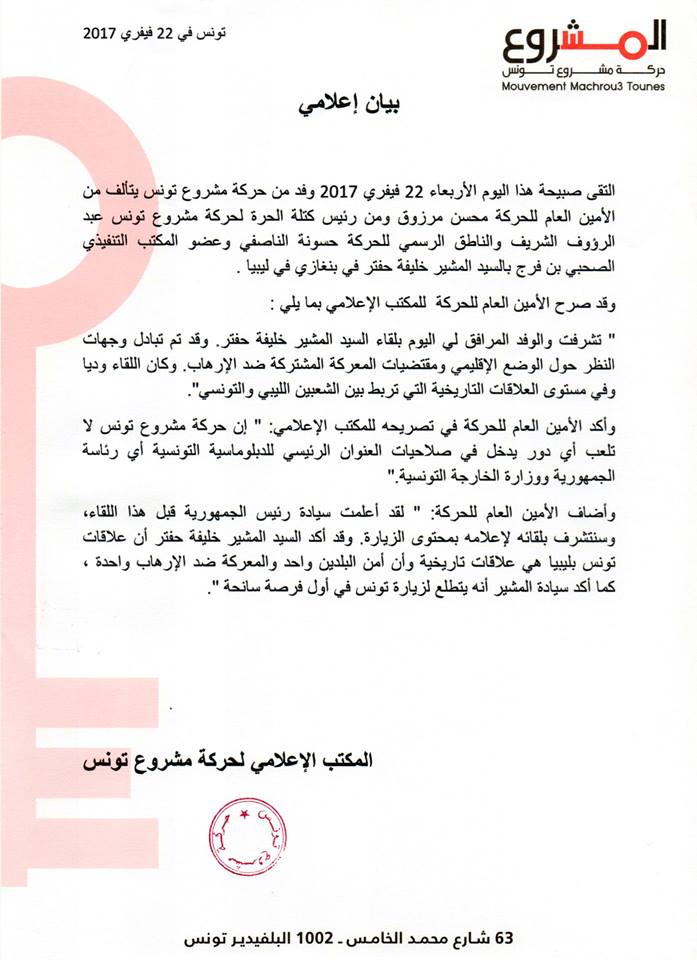 و جاء في بيان حركة مشروع تونس، أنّ مرزوق كان قد أعلم رئيس الجمهورية الباجي قائد السبسي بهذا اللقاء قبل حصوله، مبيّنة أنّها لا تلعب أي دور يدخل في صلاحيات العنوان الرئيسي للدبلوماسية التونسية أي رئاسة الجمهورية ووزارة الخارجية.