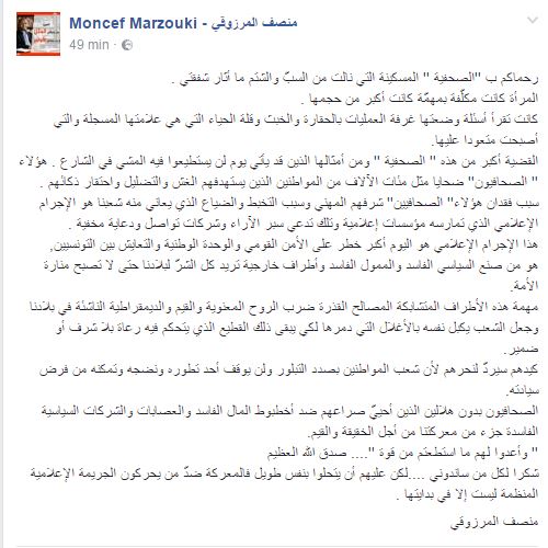 وأكّد المنصف المرزوقي أنّ القضية أكبر من هذه الصحفية ومن أمثالها الذين قد يأتي يوم لن يستطيعوا فيه المشي في الشارع.