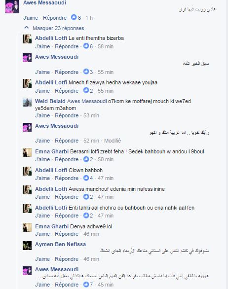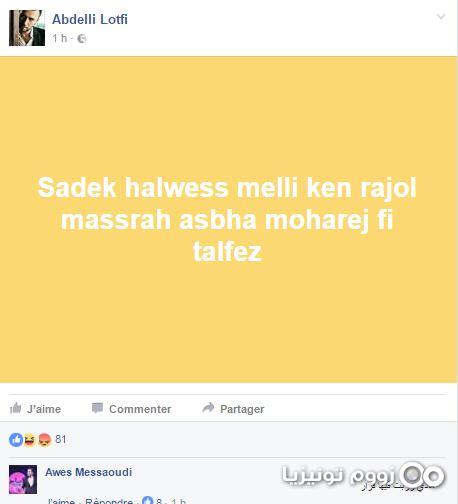 وقد كان للكوميدي أوس المسعودي، وهو من فريق العمل أيضاً، أوّل تعليق على منشور لطفي العبدلي، إذ اِعتبر هذا الكلام "مزروب" وليس في محله غير أنّ العبدلي أصر على نقده لأنّه يرى الأمور من زاوية "الفن" ليس إلاّ، الشيء الذي ردّ عليه أوس بتذكيره بأحد جمله التي يقول فيها أنّه غير مُطالب بقواعد الفن وأنّ المهم هو إضحاك الناس وهو ما يقوم به الصادق حلواس.