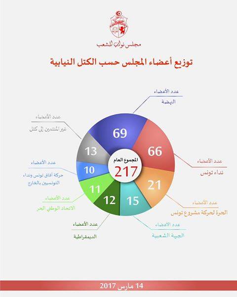 وتُواصل كتلة حركة النهضة تصدر الكتل بالبرلمان بـ69 نائبا، فيما أصبع عدد أعضاء كتلة نداء تونس 66 عضوا.