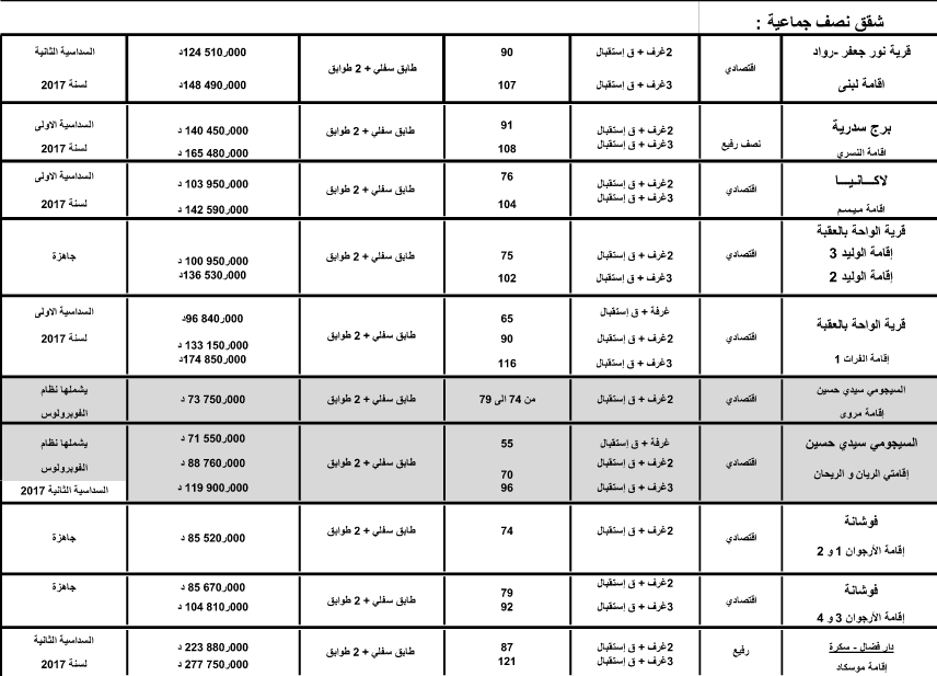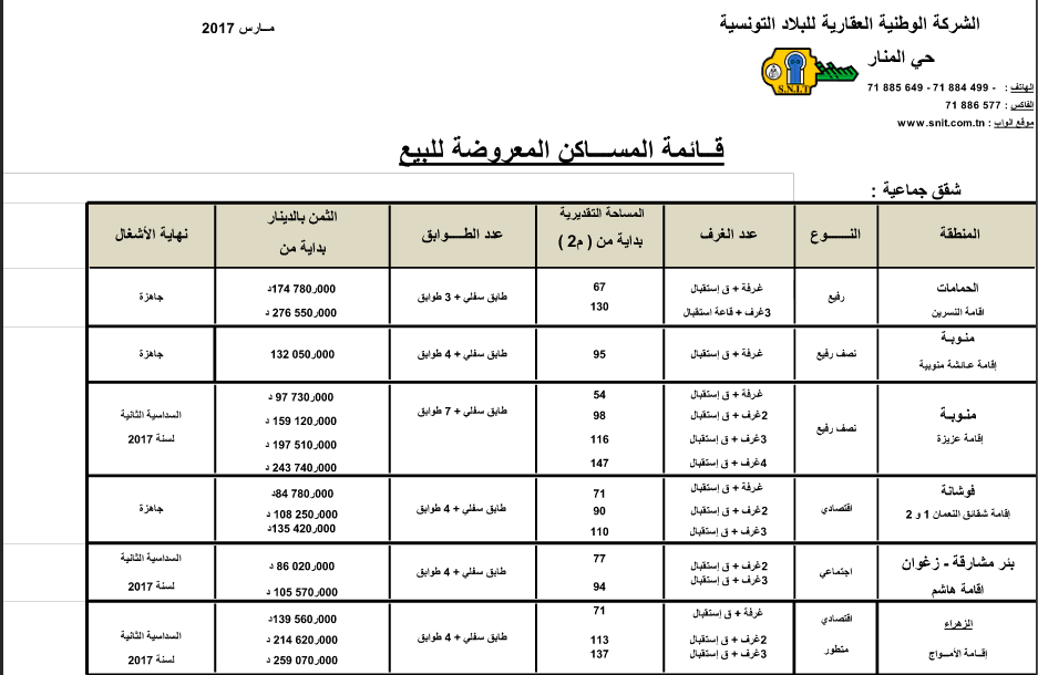 نشرت الشركة الوطنيّة العقاريّة للبلاد التونسيّة قائمة المشاريع المعروضة للبيع لشهر نوفمبر 2017: