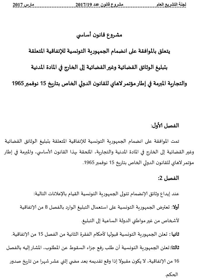 زووم - تمّ اليوم 15 مارس 2017، الموافقة على مشروع قانون أساسي يتعلق بالموافقة على انضمام الجمهورية التونسية للاِتفاقية المتعلقة بتبليغ الوثائق القضائية وغير القضائية إلى الخارج في المادة المدنية والتجارية المبرمة في إطار مؤتمر لاهاي للقانون الدولي الخاص بتاريخ 15 نوفمبر 1965.