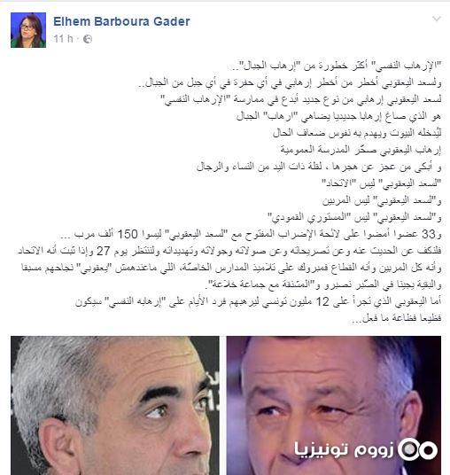 وأضافت بربورة، في تدوينة على الفايسبوك، أنّ الكاتب العام لنقابة التعليم الثانوي لسعد اليعقوبي أخطر من أخطر إرهابي في أي حفرة في أي جبل من الجبال، وأنّه إرهابي من نوع جديد أبدع في ممارسة الإرهاب النفسي.
