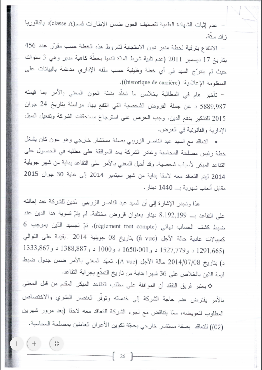 وبيّنت الشركة المذكورة أنّها قامت بتذكير الهمامي بخلاص ما تخلّد بذمته من جملة القروض الشخصية التي اِنتقع بها، غير أنّه لم يقم إلى حد الآن بإرجاع مستحقات الشركة.