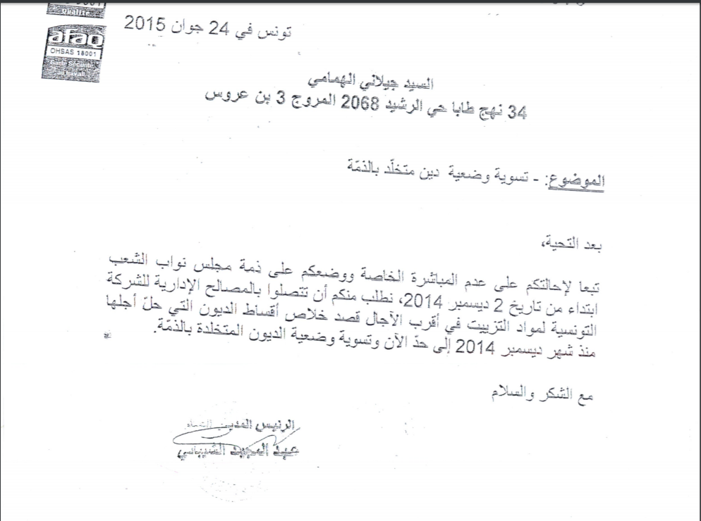 وجاء في الوثائق، أنّ الشركة التونسية لمواد التزييت طالبت الجيلاني الهمامي بالاِتصال بمصالحها في أقرب الآجال قصد خلاص أقساط الديون، وذلك قبل ترشحه إلى مجلس نواب الشعب.