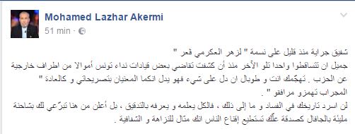 وقد ردّ لزهر العكرمي على هذاالتصريح، عبر تدوينة على صفحته الرسمية، بقوله أنّ هذا التهجّم الذي جاء منه ومن رئيس كتلة النداء سفيان طوبال يدل على أنّهما المعنيان بتصريحاته التي أكّد فيه أنّ هنالك من يتقاضى في أموال مشبوهة.