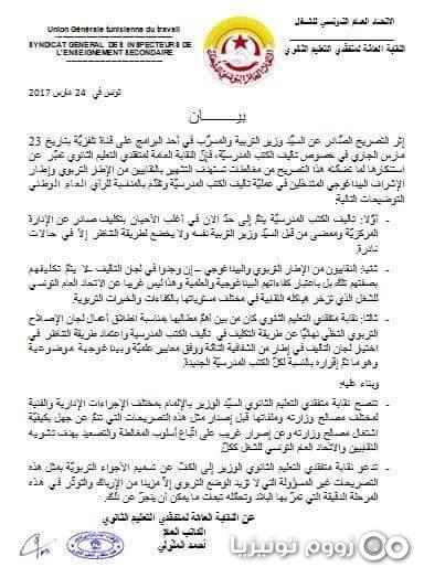 زووم - إثر التصريح الذي سُرِب لوزير التربية خلال فقرة "كاميرا حسام" على قناة التاسعة، أصدرت النقابة العامة لمتفقّدي التعليم الثانوي اليوم الجمعة 24 مارس 2017 بياناً للردّ عليه.