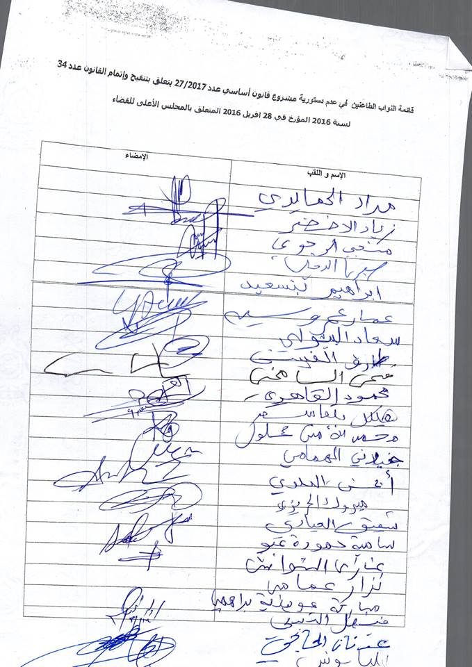 تقدّم عدد من نواب المعارضة، مساء يوم الثلاثاء 28 مارس 2017، بطعن في عدم دستورية مشروع القانون الأساسي عدد 2017/27 الذي يهمّ تنقيح وإتمام القانون عدد 34 لسنة 2016 المؤرخ في 28 أفريل 2016 والمتعلّق بالمجلس الأعلى للقضاء، وذلك بعد أن تمّت المصادقة عليه من قِبل نواب الائتلاف الحاكم عشية اليوم.