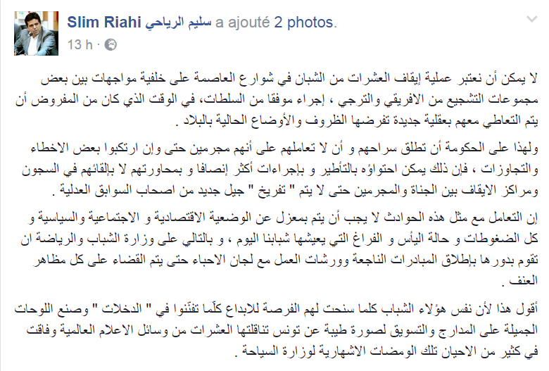 وفي هذا السياق، أكّد أنّ رئيس النادي الإفريقي، في تدوينة على صفحته بالفيسبوك، أنّ على الحكومة أن تطلق سراح العشرات من الشبان الذي تمّ إيقافهم، مبيّنا أنّه كان من المفروض أنّ يتم التعاطي معهم بعقلية جديدة تفرضها الظروف والأوضاع الحالية بالبلاد.