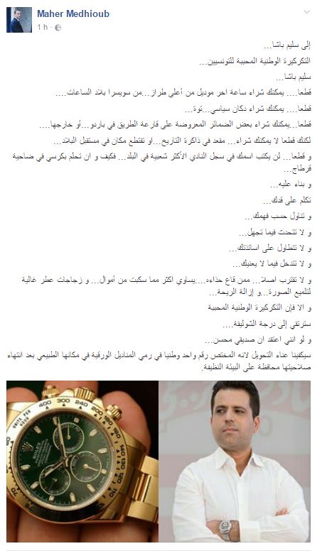 كما دعاه في تدوينته النارية إلى عد الحديث فيما يجهل وعدم التطاول على أساتذته، وفق تعبيره، مضيفا "و لا تقترب اصلا... ممن قاع حذائه....يساوي اكثر مما سكبت من أموال... و زجاجات عطر غالية لتلميع الصورة...و إزالة الريحة... و الا فإن التكركيرة الوطنية المحببة .. سترتقي إلى درجة الشوليقة و لو انني اعتقد ان صديقي محسن...سيكفينا عناء التحويل لانه المختص رقم واحد وطنيا في رمي المناديل الورقية في مكانها الطبيعي بعد انتهاء صلاحيتها محافظة على البيئة النظيفة".