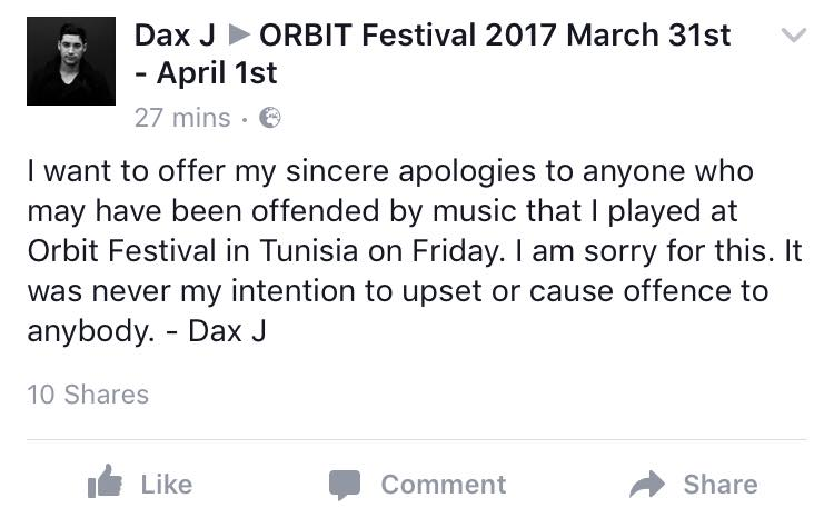 وأكّد "الدي جي"، من خلال تدوينة على الفايسبوك"، أنّه لم يكن يقصد الإساءة إلى أي أحد.
