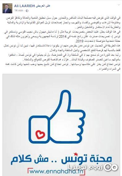 واِعتبر علي العريض أنّ هذه التصريحات صدرت عمّن رشح نفسه في 2014 لرئاسة الجمهورية ويسعى وآخرون مثله لذلك في حملة انتخابية متواصلة لانتخابات 2019، مُشيراً إلى أنّ هذه الطريقة في الحديث عن تونس ممن يفترض منهم ان يكونوا دعاة للاستثمار فيها، تبين لنا أن تونس تمثل فقط بالنسبة لهم فرصة للنفع الشخصي ولنيل السلطة والجاه والمال.
