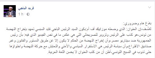 وحوّل الباجي معنى تصريحاته لكون الرئيس مع التعايش مع حركة النهضة واحتواؤها حتى تذوب في النسيج التونسي، مُوضّحا أنّ الباجي قائد السبسي أراد إخراج النهضة عبر صناديق الإقتراع، غير أنّه بالرجوع لمقطع الفيديو نجد أنّه لم يذكر ذلك بتاتاً واِكتفى بتأكيده أنّ مصير النهضة الذي خطّط له السبسي سيكون الخروج من الحكم عاجلاً أم آجلاً.
