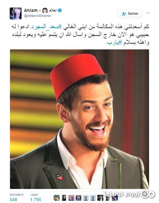 وقد اِتصل لمجرّد بالفنانة الإماراتية أحلام الشامسي فور خروجه من السجن، حيث دوّنت التالي : "كم أسعدتني هذه المكالمة من اِبني الغالي سعد المجرد أدعوا له حبيبي هو الان خارج السجن واسال الله ان يتمم عليه ويعود لبلده واهله بسلام يارب".