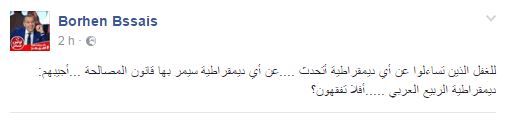وأضاف بسيّس ، في تدوينة على الفايسبوك اليوم السبت 29 أفريل 2017، أنّ "الغْفّل" الذين تسائلوا عن الديمقراطية التي يتحدث عنها فإنّه يُؤكّد لهم أنّه يتحدث عن ديمقراطية الربيع العربي.