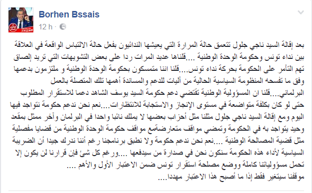 قال القيادي بحركة نداء تونس برهان بسيس في تعليقه على قرار إقالة وزير التربية ناجي جلول إنه وبعد هذا القرار "تتعمق حالة المرارة التي يعيشها الندائيون بفعل حالة الالتباس الواقعة في العلاقة بين نداء تونس وحكومة الوحدة الوطنية ".