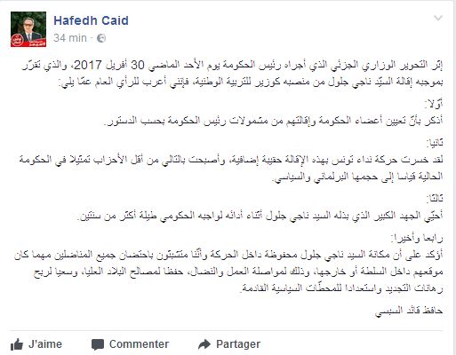 واضاف حافظ قائد السبسي في تدوينة له على صفحته الرسميّة على الفايسبوك قائلا "أحيّي الجهد الكبير الذي بذله ناجي جلول أثناء أدائه واجبه الحكومي طيلة أكثر من سنتين" مشيرا الى أن مكانته محفوظة داخل الحركة وأنّهم متشبثون باحتضان جميع المناضلين مهما كان موقعهم داخل السلطة أو خارجها، وذلك لمواصلة العمل والنضال، حفظا لمصالح البلاد العليا، وسعيا لربح رهانات التجديد واستعدادا للمحطّات السياسية القادمة".