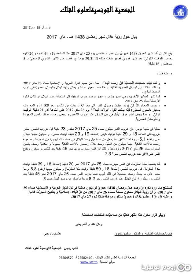 زووم - توقعت الجمعية التونسية لعلوم الفلك بالحساب الفلكي أن يكون أول يوم من شهر رمضان هو يوم السبت الموافق لـ27 ماي 2017.