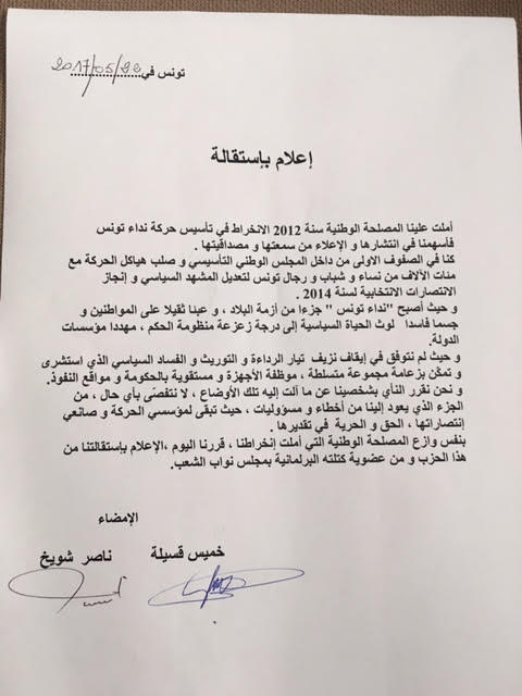 كما قدّم أعضاء "الهيئة التسييرية" بحزب نداء تونس، رضا بلحاج وبوجمعة الرميلي وفوزي معاوية وعبد العزيز القطي، استقالتهم من الحزب عن طريق عدل تنفيذ.