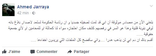 وأضاف في تدوينة له على صفحته الرسمية على الفايس بوك أنه قد علم من "مصادر موثوقة" أن والده "قد تمت تصفيته جسديا و ان رئاسة الحكومة تستعد لاصدار بلاغ بانه توفي بنوبة قلبية وهذا هو السر في رفضهم كشف مكان احتجازه سواء لنا كعائلة او للمحامين او لأي جمعية حقوقية".