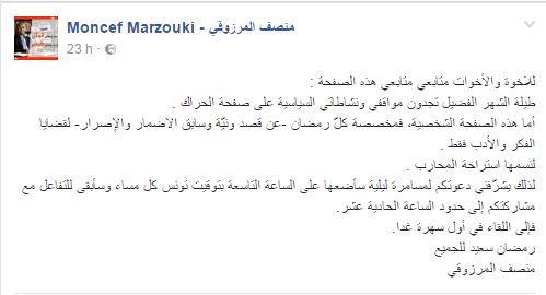 وأضاف المرزوقي ، في تدوينة على صفحته الرسمية ، أنّه قرّر ككل سنة الاِمتناع عن السياسة في صفحته الخاصة من أجل تخصيصها لقضايا الفكر والأدب فقط وذلك بمُناسبة شهر رمضان، مُوضّحاً أنّ مواقفه ونشاطاته السياسية ستكون موجودة على صفحة الحراك .