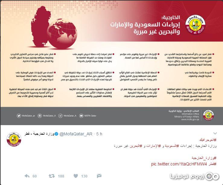 وقالت الوزارة أنّ دولة قطر تعرّضت إلى حملة تحريض تقوم على افتراءات وصلت حد الفبركة الكاملة ما يدل على نوايا مبيته للإضرار بالدولة علما بأن دولة قطر عضو فاعل في مجلس التعاون الخليجي وملتزمة بميثاقه وتحترم سيادة الدول الاخرى ولا تتدخل في شؤونها الداخلية كما تقوم بواجباتها في محاربة الارهاب والتطرف.