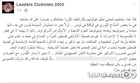 وردّاً على ذلك نشرت إحدى أقدم مجموعات النادي الإفريقي و أشهرها "Leaders Clubistes 2003" توضيحاً بيّنت فيه أنّ الشعار الذي رُفِعَ هو "رسالة ثورية" وأنّهم لا يقومون بالسياسية لأنّهم في حدّ ذاتهم سياسة و إيديولوجيا.