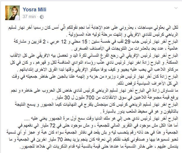 وقالت يسرى الميلي " أمس كان رسميا آخر نهار لسليم الرياحي كرئيس للنادي الافريقي و إنتهت مرحلة توليه هذه المسؤولية ".