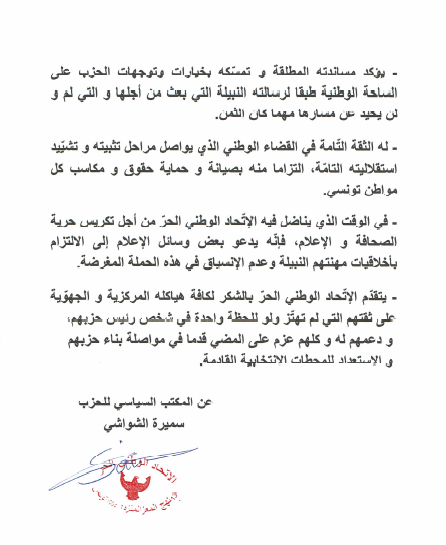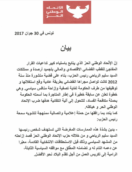 وقال الاتحاد أنّه وقع استغلال القضية و توظيفها من طرف الحكومة لغاية تصفية وإزاحة منافس سياسي، مُعتبراً ذلك خطوة تعلن عن سابقة خطيرة في إطار المتاجرة بحملة مكافحة الفساد، لتتحول إلى آلية انتقائية هدفها ضرب الإتحاد الوطني الحر و هياكله، وذلك وفق تعبيره.
