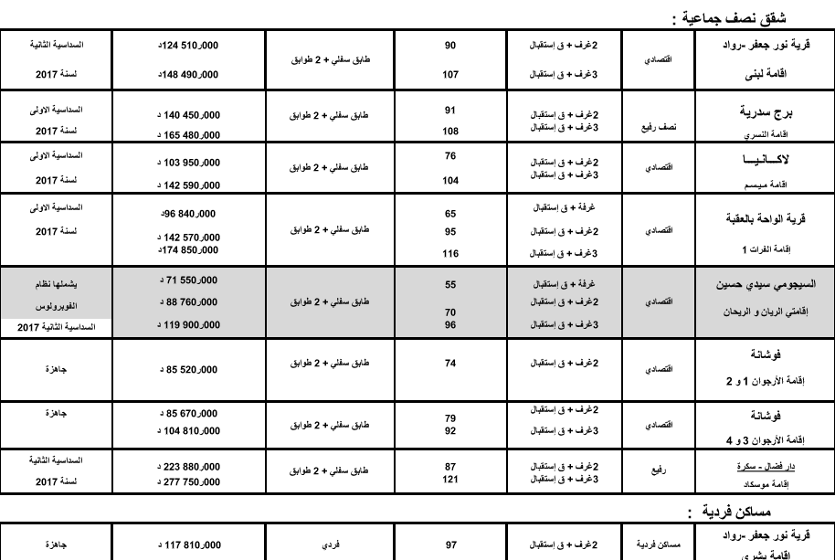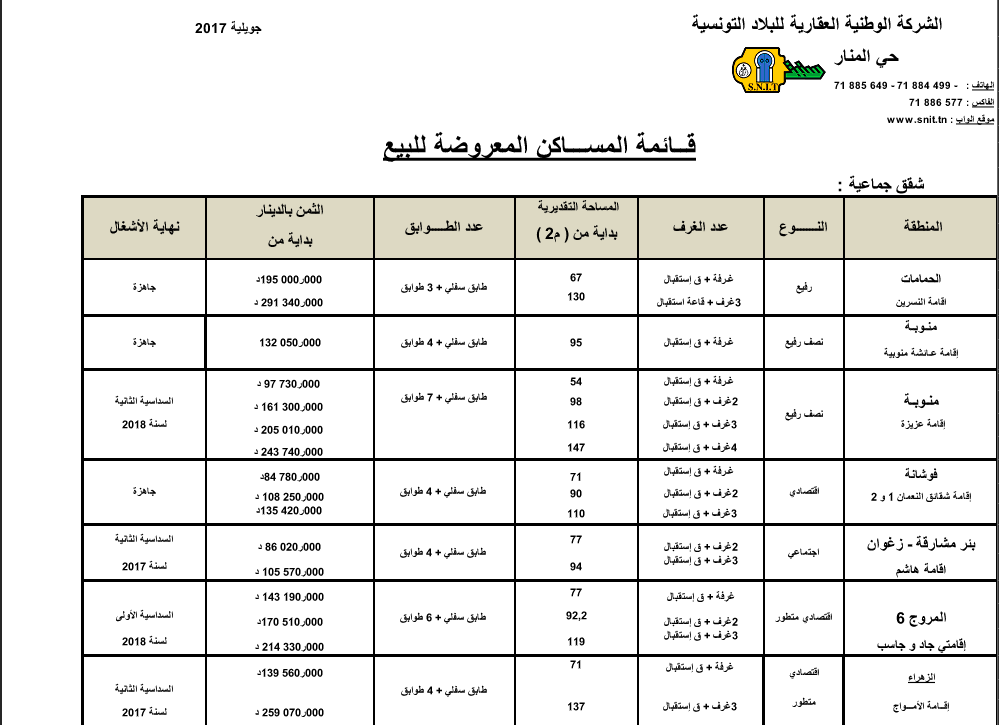 نشرت الشركة الوطنيّة العقاريّة للبلاد التونسيّة قائمة المشاريع المعروضة للبيع لشهر نوفمبر 2017: