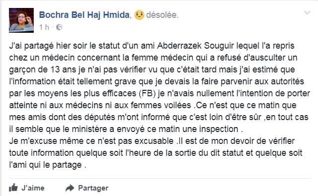 واوضح بلحاج حميدة في تدوينة على الفياس بوك أنّها نقلت الخبر عن صديق لها دون التثبت من صحته، لـ "يتبيّن أن الخبر غير دقيق وبعيد عن الصحة" مشددة على أن هدفها لم يكن الإساءة لقطاع الأطباء أو المحجّبات.