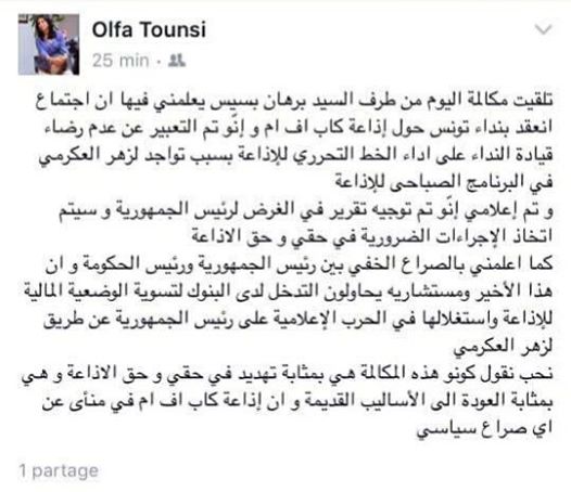 وقال بسيّس أنّ القيادة غير راضية بسبب تواجد لزهر العكرمي في البرنامج الصباحى للإذاعة، حيث أكّدت آلفة التونسي أنّه تمّ إعلامها أنّ تقرير وُجّها في الغرض لرئيس الجمهورية و سيتم اِتخاذ الإجراءات الضرورية في حقها و حق الاذاعة.