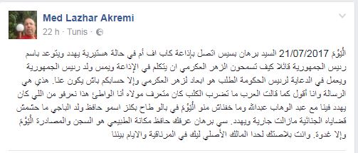 ووفق تدوينة العكرمي على حسابه الخاص على الفايسبوك، فإنّ بسيّس قال "كيف تسمحون للزهر العكرمي ان يتكلم في الإذاعة ويمس ولد رىيس الجمهورية ويعمل في الدعاية لرئيس الحكومة الطلب هو ابعاد لزهر العكرمي وإلا حسابكم باش يكون عنا".