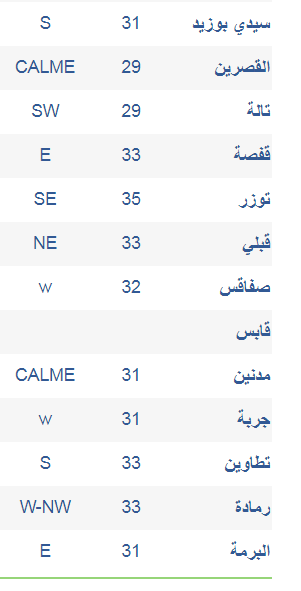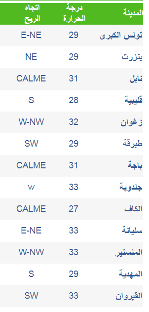 وقد أشار الرصد الجوي إلى أنّه تتراوح الحرارة القصوى بين 32 و 37 درجة بالشمال وبجهة الساحل وبين 41 و 47 درجة ببقية الجهات مع ظهور الشهيلي.