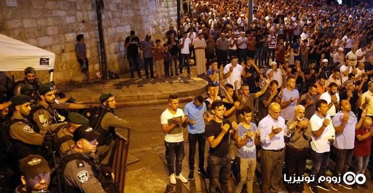 وكان آلاف الفلسطينيين يصلون في الشوارع المحيطة بالحرم، بعد أن طالبتهم المرجعيات الدينية في القدس بعدم الصلاة داخله احتجاجا على الإجراءات الإسرائيلية.