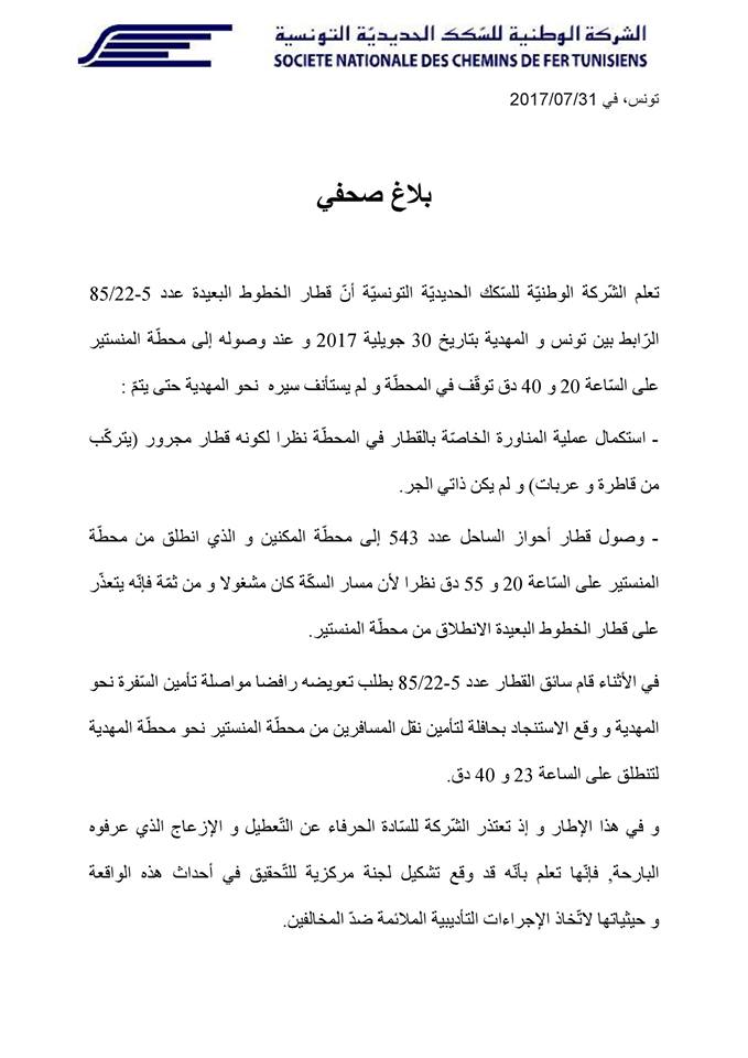 وللإشارة فإنّ سائق قطار تونسالمهدية والمراقب قاموا بمغادرة محطة القطارات على مستوى المنستير لمدة زادت عن 4 ساعات، حيث قد قد علق 50 مسافرا في رحلة القطار المتجه من تونس إلى المهدية.