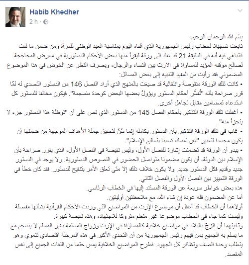 أما عن مضمون ما قاله، فبيّن الحبيب خضر أنّ الخطاب قد أغفل أن موضوع الإرث من المواضيع التي وردت الأحكام القرآنية بشأنها مفصلة وليست كما جاء في الخطاب موضوعا غير منظم متروكا للاجتهاد، وهذه نقيصة كبيرة، مُضيفاً أنّ الزجّ بالبلاد في مواضيع خلافية كالمساواة في الإرث وزواج المسلمة بغير المسلم لا ينسجم مع ما يسلم به الجميع بمن فيهم رئيس الجمهورية من أن التحدي الأكبر في هذه المرحلة اقتصادي تنموي وهو يتطلب وحدة الصف وتظافر كل الجهود.