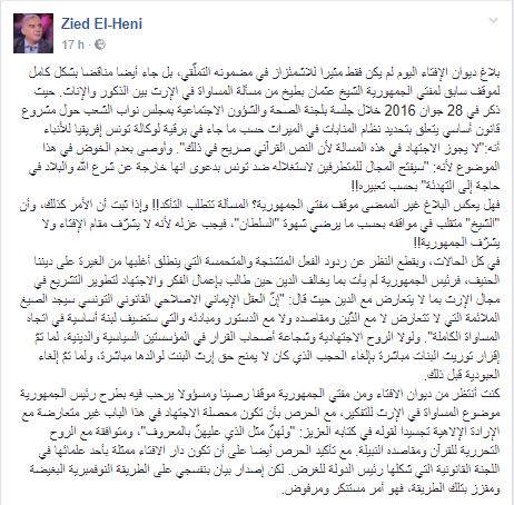 وتابع الهاني "فهل يعكس البلاغ غير الممضى موقف مفتي الجمهورية؟ المسألة تتطلب التأكد!! وإذا ثبت أن الأمر كذلك، وأن "الشيخ" متقلب في مواقفه بحسب ما يرضي شهوة "السلطان"، فيجب عزله لأنه لا يشرّف مقام الإفتاء ولا يشرّف الجمهورية!!، مشدّدا على أنّ " إصدار بيان بنفسجي على الطريقة النوفمبرية البغيضة ومقزز بتلك الطريقة، فهو أمر مستنكر ومرفوض".