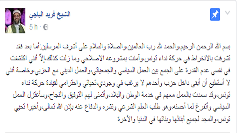 وبرّر فريد الباجي قراره بعدم القدرة على الجمع بين العمل السياسي والجمعياتي والعمل الديني مع الحزبي والبقاء داخل حزب وأحدهم لا يرغب في وجوده.