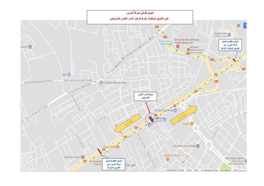 ويأتيوذلك لانجاز أشغال تركيز المنشأة الحديدية للممر العلوي للمترجلين حيث يمكن لمستعملي هاته الطريق المرور عبر الطريق الموازية (أمام جامع عين زغوان ) للاتجاه نحو المرسى والمرور عبر الطريق الوطنية عدد 10 (على مستوى المركب التجاري كارفور) ثم شارع خالد بن الوليد فالطريق الجهوية رقم 544 بالعوينة للاتجاه نحو تونس العاصمة.