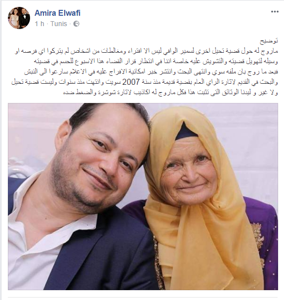 وأضافت أميرة الوافي، عبر تدوينة على صفحتها الخاصة بالفايسبوك اليوم الثلاثاء 26 سبتمبر2017، أنّه "بعد ما اِنتشر بأن ملف شقيقها سوي والبحث اِنتهى وأنّ هناك إمكانية الإفراج عليه في الإعلام سارعوا إلى النبش والبحث في القديم لإثارة الرأي العام بقضية قديمة منذ سنة 2007.