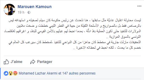 وأضاف كمّون، في تدوينة فايسبوكية، أنّ هنا نتحدث عن رئيس حكومة كان سيتم تصفيته و اِستهدافه ليس بالرصاص فقط بل بالصواريخ و الأسلحة الثقيلة من جهة في القطر الليبي خططت و ضخت ملايين الدولارات للتنفيذ حتى تكون العملية بلا أدلّة، وذلك وفق قوله.