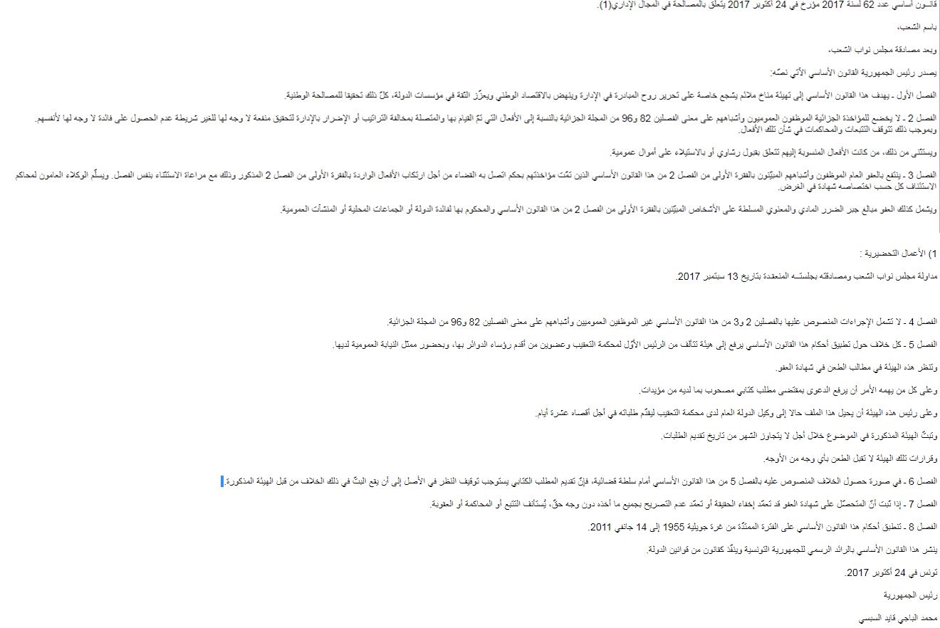 يُذكر أنّ رئيس الجمهورية ختم يوم الثلاثاء المنقضي القانون الأساسي المتعلّق بالمصالحة في المجال الإداري وذلك إثر ورود إحالة في هذا الشأن من الهيئة الوقتية لمراقبة دستورية مشاريع القوانين تضمّنت عدم حصول الأغلبيّة المطلقة لاتخاذ قرار بعد توصل الهيئة بطعن من مجموعة من النواب .