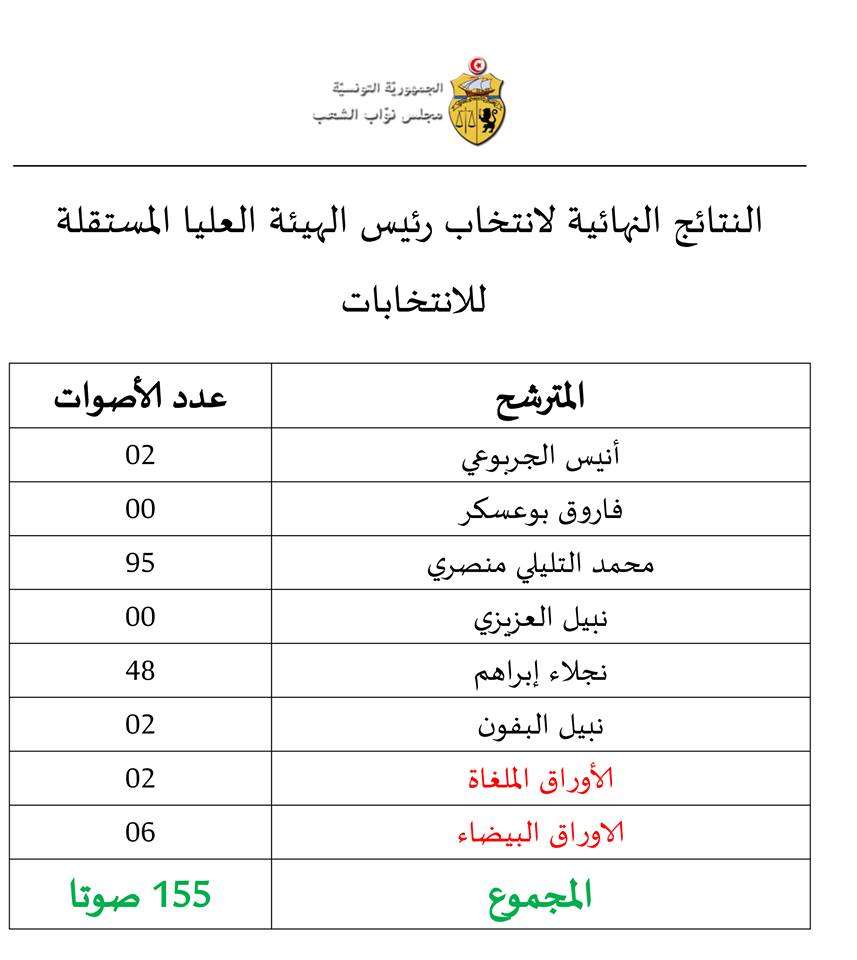 ولم يتحصّل أيّ مترشّح على عدد الأصوات المطلوب (109) وسوف يتمّ مواصلة التصويت على انتخاب رئيس للهيئة العليا المستقلة للانتخابات في دورة ثانية من ضمن المترشّحين المتحصّلين على أعلى عدد من الأصوات.