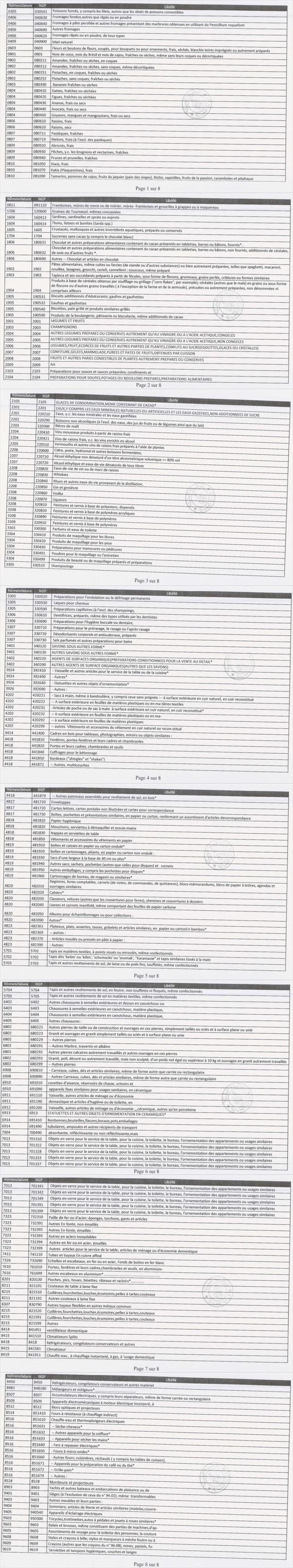 ومن بين المواد المستوردة المعنيّة بهذا القرار نجد: المياه المعدنيّة، أنواع من النبيذ والجعة، العسل، الشوكلاطة، الرّخام، مواد التجميل، إطارات مطاطيّة، ملابس وأحذية، أثاث، أجبان، غلال...